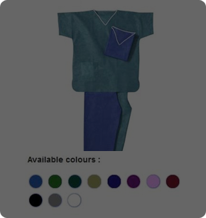 Two-part disposable scrub clothing according to EN 13795, parts 1-3, made of fluid repellent, breathable non-woven fabric; with high resistance to penetration by fluid and bacteria; abrasion-resistant and low tinting; tunic with V-neck, short sleeves and chest pocket; trousers featuring straight cut legs with an elastic band at the waist; available in a variety of colours.